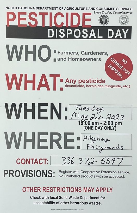 Collapse ▲Pesticide collection day will be held on Tuesday – May 2, 2023 @ the Alleghany County Fairgrounds from 10 a.m. – 2 p.m. Any insecticide, herbicide, fungicide etc will be accepted. Contact the Alleghany Extension Office @ 336-372-5597 with any questions.
